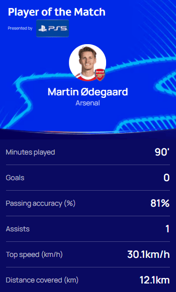 掌控比赛,厄德高当选阿森纳vs奥林匹亚科斯全场最佳